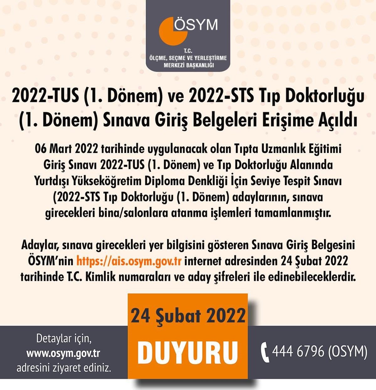 Ölçme, Seçme ve Yerleştirme Merkezi (ÖSYM) tarafından, 6 Mart’ta uygulanacak olan Tıpta Uzmanlık Eğitimi Giriş Sınavı 2022-TUS (1. Dönem) ve Tıp Doktorluğu Alanında Yurtdışı Yükseköğretim Diploma Denkliği için Seviye Tespit Sınavı 2022-STS Tıp Doktorluğu (1. Dönem) giriş belgeleri erişime açıldı.